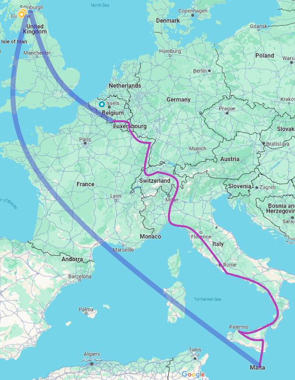 I traced a route on my trusty map south from Belgium, immediately taking in a couple of places I had never been before, Luxembourg and Strasbourg. I was going to have to cross Switzerland, which gave me the chance to travel on the Bernina Express – the train with the panoramic windows which travels through the Alps into northern Italy. From there, I marked a route down the west coast of Italy, including an opportunity to visit either Pompeii or Herculaneum at Naples, and the chance to travel on the train that GETS ON the ferry to Sicily. And finally, the ferry to Malta.